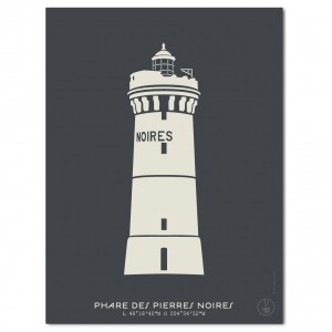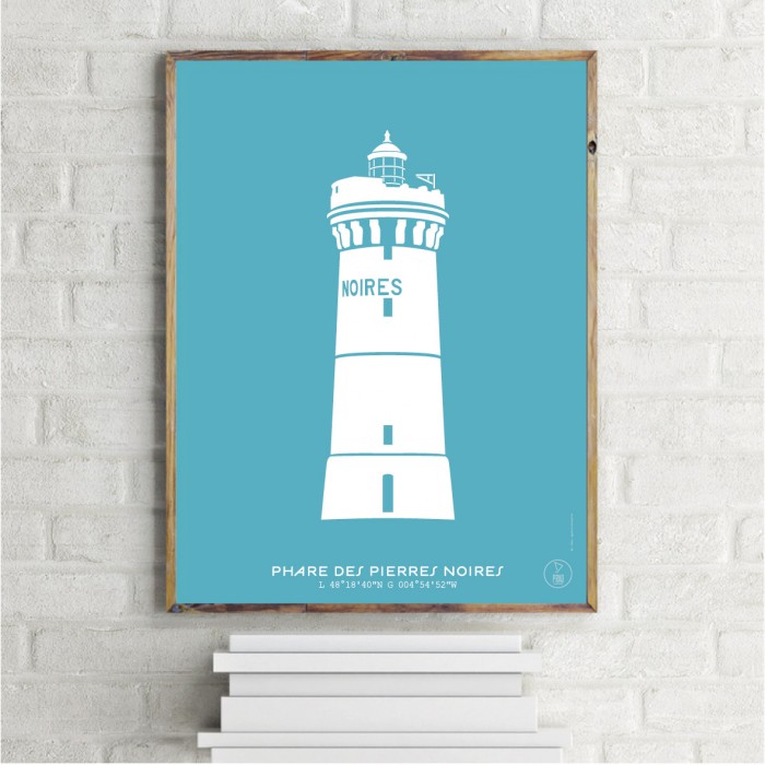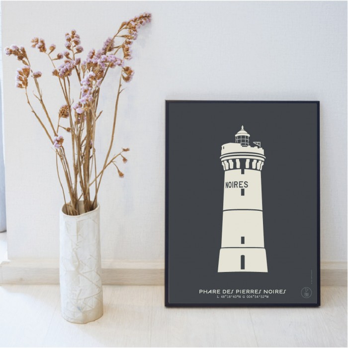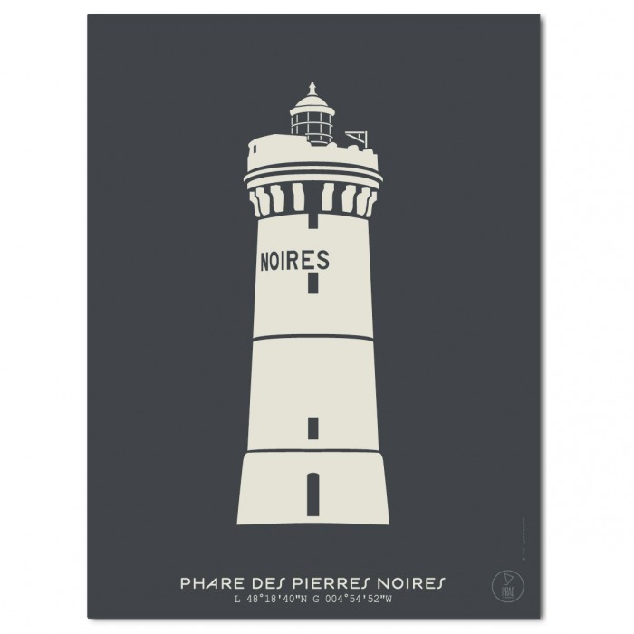 Affiche du phare des Pierres Noires (proche de Brest), créée avec le style minimaliste et moderne du Prao Studio. Imprimée en 30x40 à La Rochelle et disponible en deux couleurs.