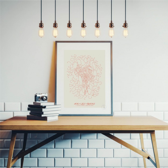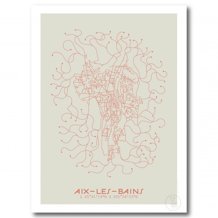 Affiche du plan de ville d'Aix-les-Bains, créée avec le style minimaliste et moderne du Prao Studio. Imprimée en 30x40 à La Rochelle et disponible en quatre couleurs.