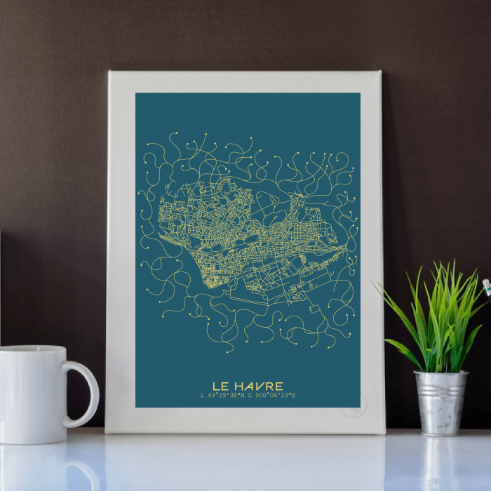 Affiche du plan de ville du Havre, créée avec le style minimaliste et moderne du Prao Studio. Imprimée en 30x40 à La Rochelle et disponible en quatre couleurs.