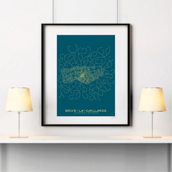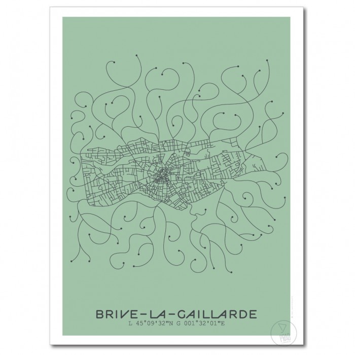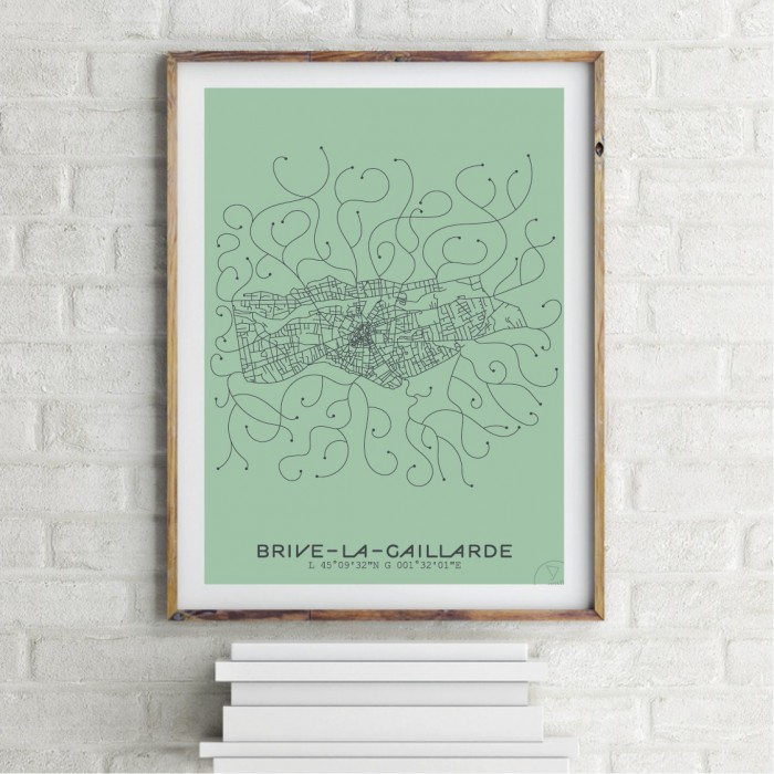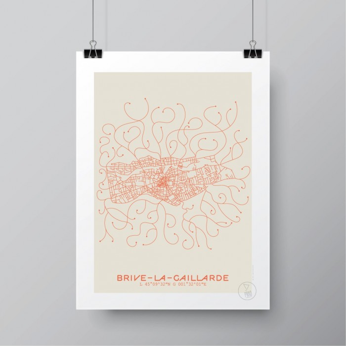Affiche du plan de ville de Brive-la-Gaillarde, créée avec le style minimaliste et moderne du Prao Studio. Imprimée en 30x40 à La Rochelle et disponible en quatre couleurs.