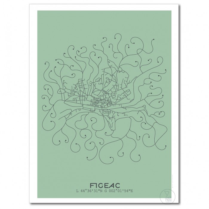 Affiche du plan de ville de Figeac, créée avec le style minimaliste et moderne du Prao Studio. Imprimée en 30x40 à La Rochelle et disponible en quatre couleurs.