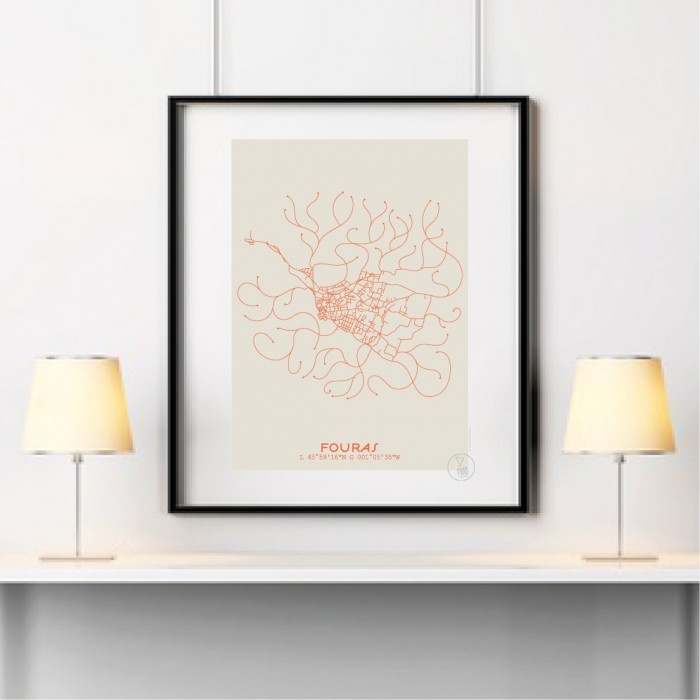 Affiche du plan de ville de Fouras, créée avec le style minimaliste et moderne du Prao Studio. Imprimée en 30x40 à La Rochelle et disponible en quatre couleurs.