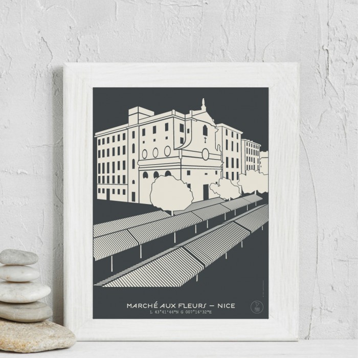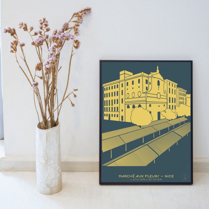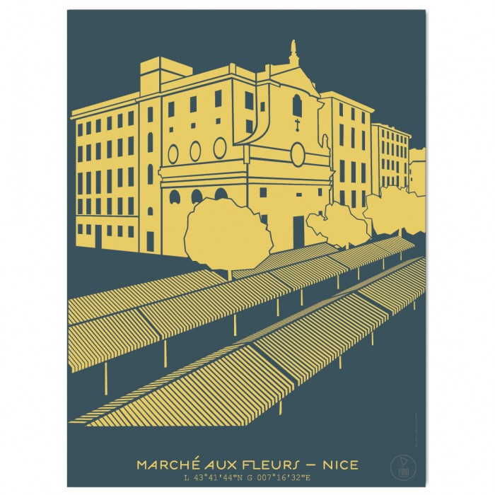 Affiche du Marché aux Fleurs à Nice, créée avec le style minimaliste et moderne du Prao Studio. Imprimée à La Rochelle et disponible en quatre couleurs.
