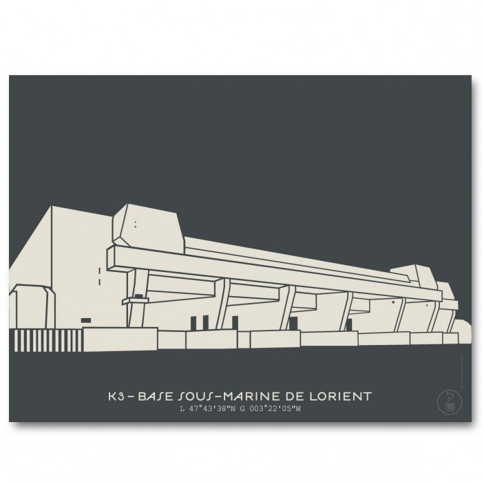 Affiche de K3 – la base sous-marine de Lorient, créée avec le style minimaliste et moderne du Prao Studio. Imprimée à La Rochelle et disponible en trois couleurs.