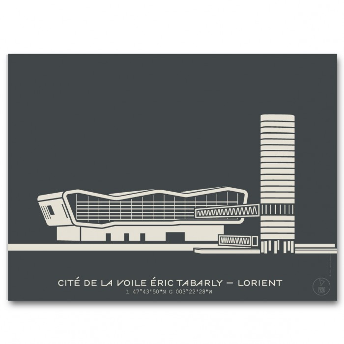 Affiche de la Cité de la Voile Éric Tabarly à Lorient, créée avec le style minimaliste et moderne du Prao Studio. Imprimée à La Rochelle et disponible en trois couleurs.