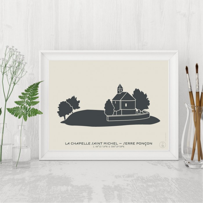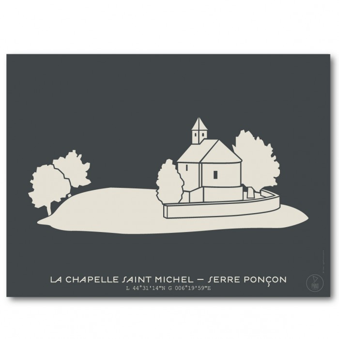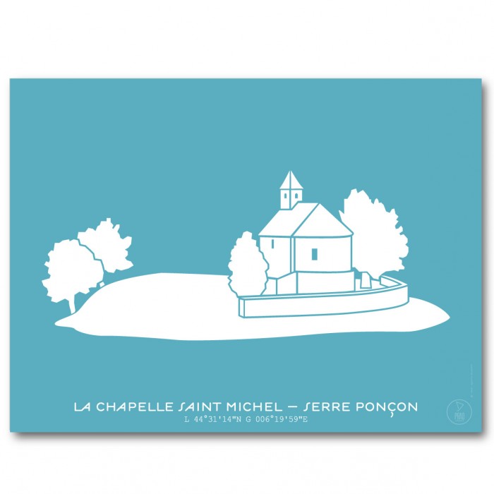Affiche da la Chapelle Saint-Michel à Serre-Ponçon, créée avec le style minimaliste et moderne du Prao Studio. Imprimée à La Rochelle et disponible en quatre couleurs.