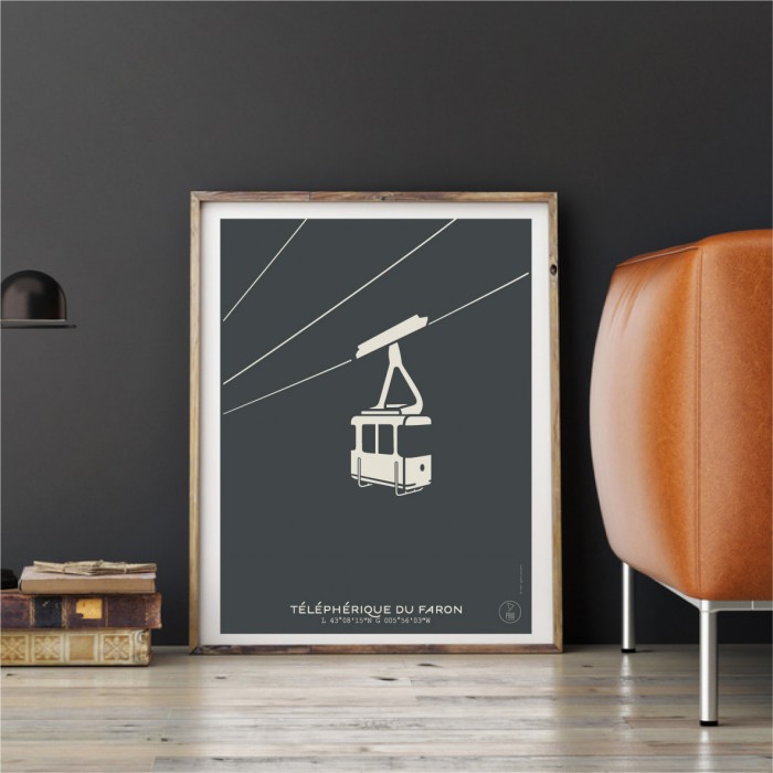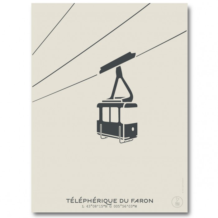 Affiche du Téléphérique du Faron vers Toulon, créée avec le style minimaliste et moderne du Prao Studio. Imprimée à La Rochelle et disponible en deux couleurs.
